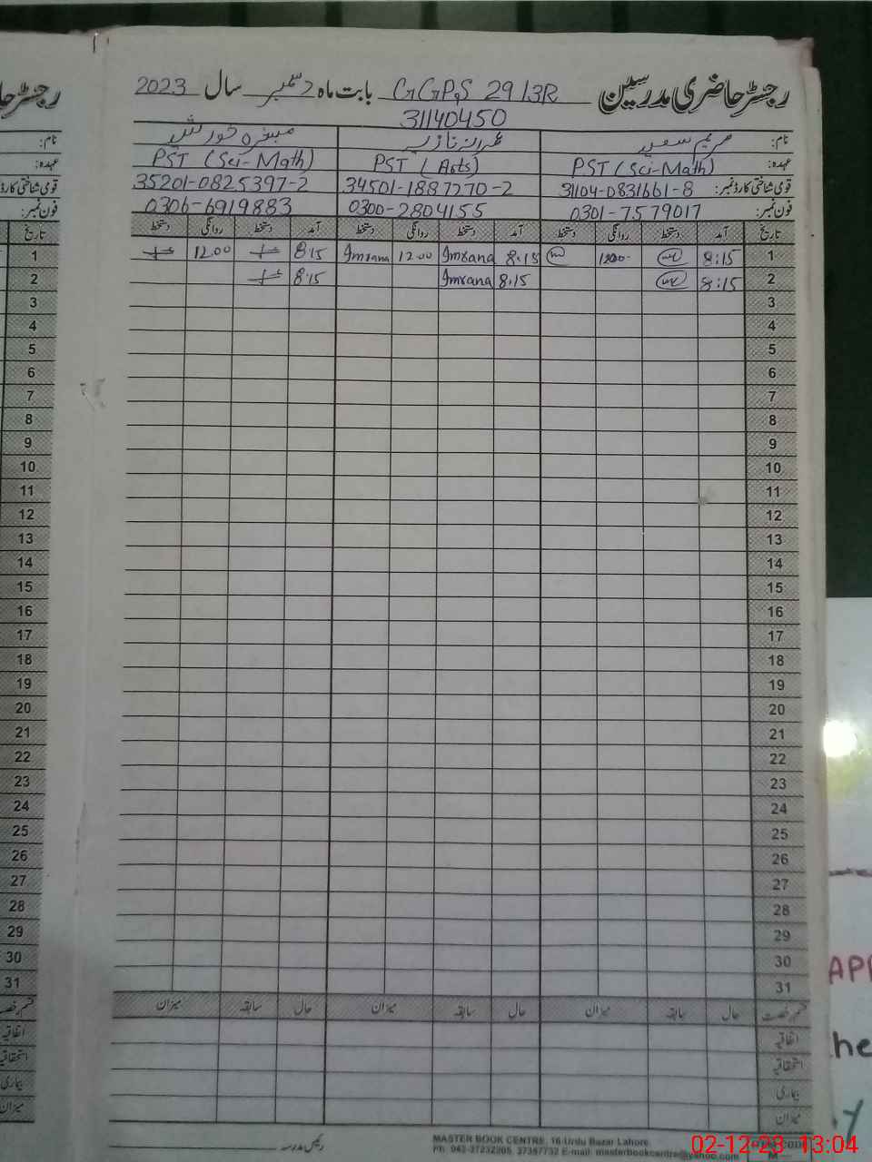 | CNIC | Full Name | Designation | R/C | Absence During Last Calender Month |