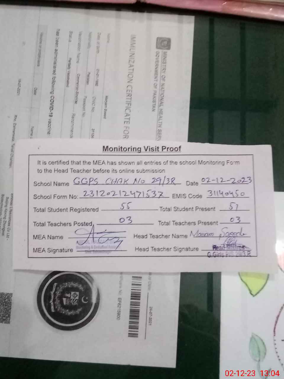 | Attendance Register | Head Teacher | MEA with School | Visit Proof |