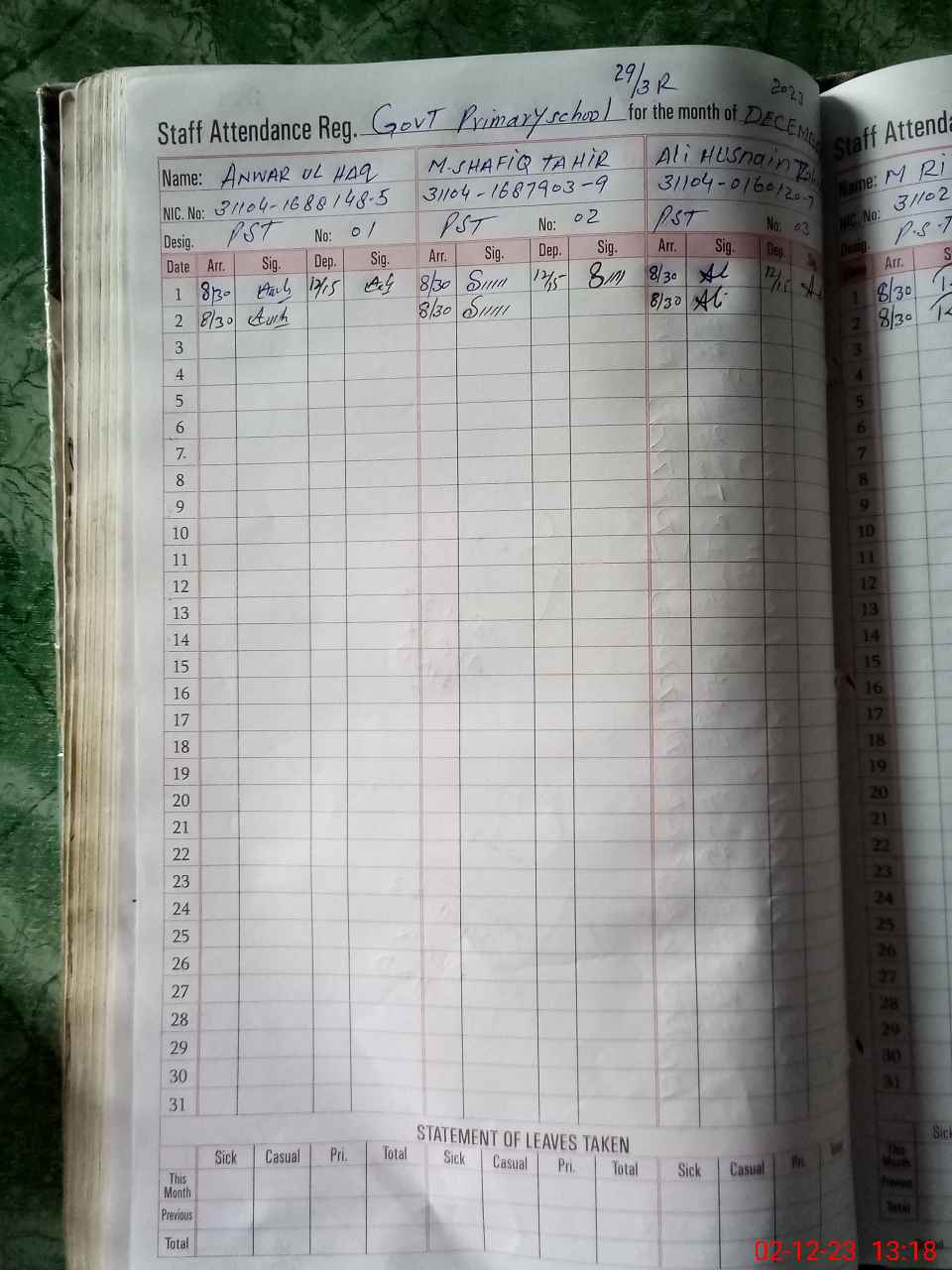 | CNIC | Full Name | Designation | R/C | Absence During Last Calender Month |