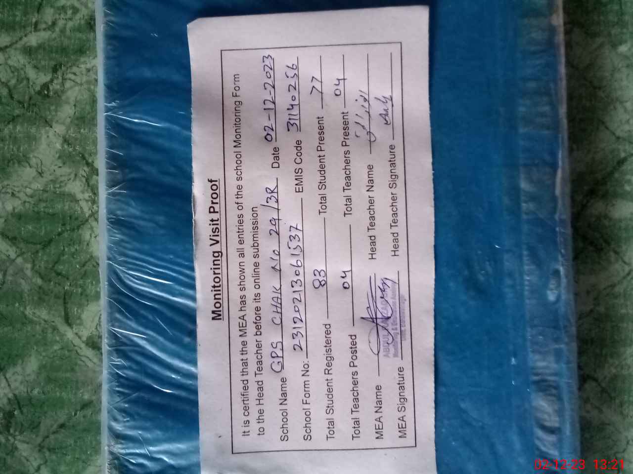 | Attendance Register | Head Teacher | MEA with School | Visit Proof |