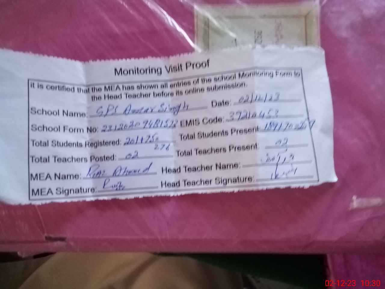 | Attendance Register | Head Teacher | MEA with School | Visit Proof |