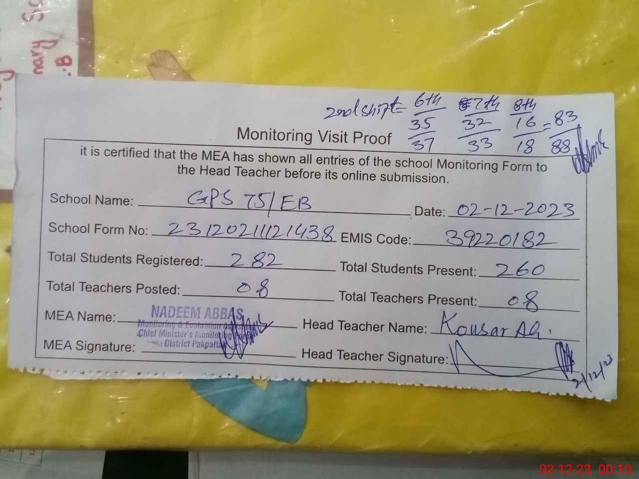 | Attendance Register | Head Teacher | MEA with School | Visit Proof |