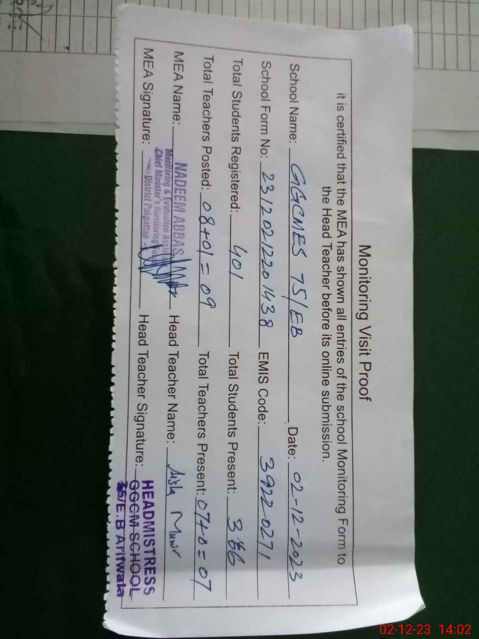 | Attendance Register | Head Teacher | MEA with School | Visit Proof |