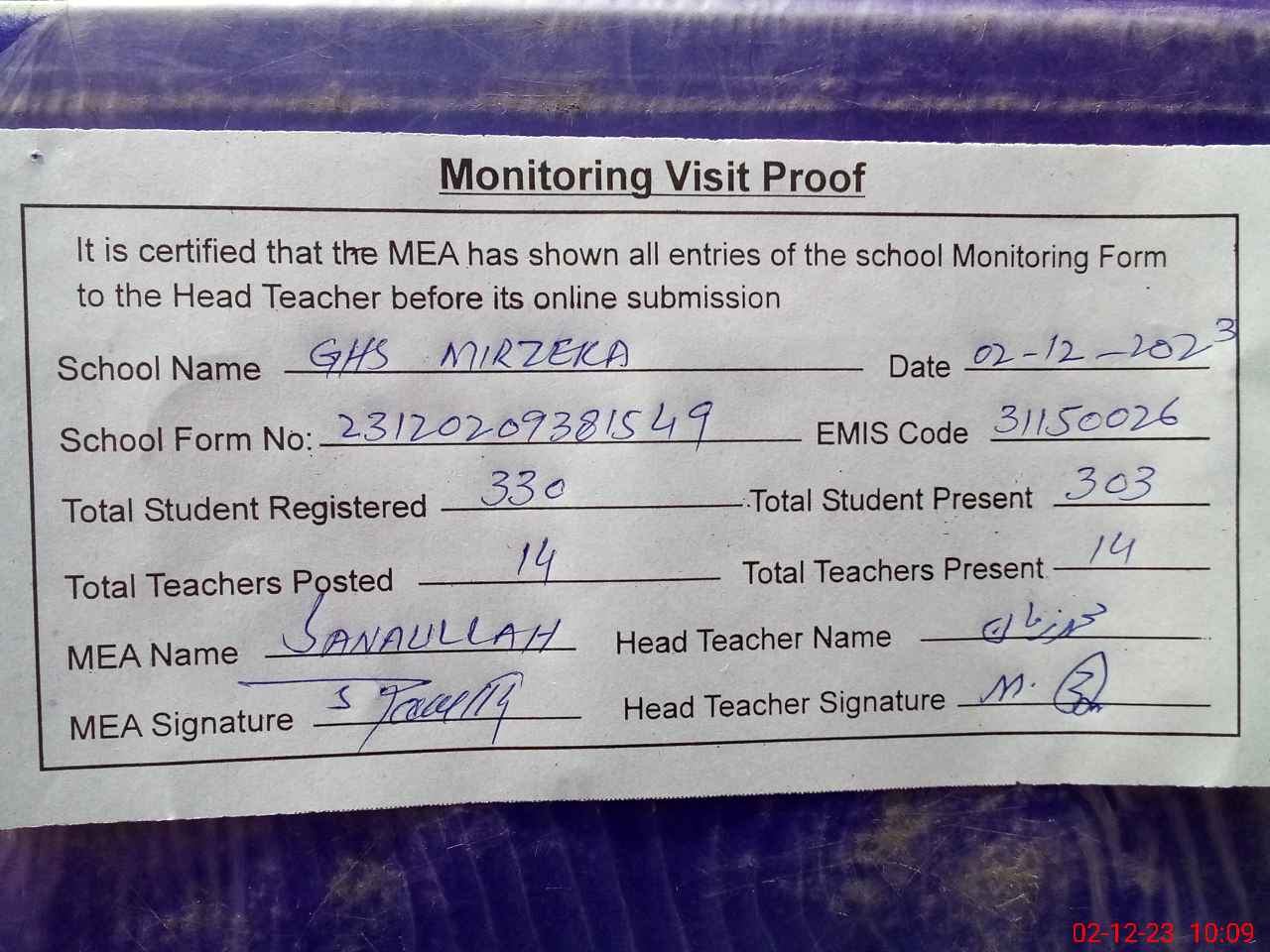 | Attendance Register | Head Teacher | MEA with School | Visit Proof |
