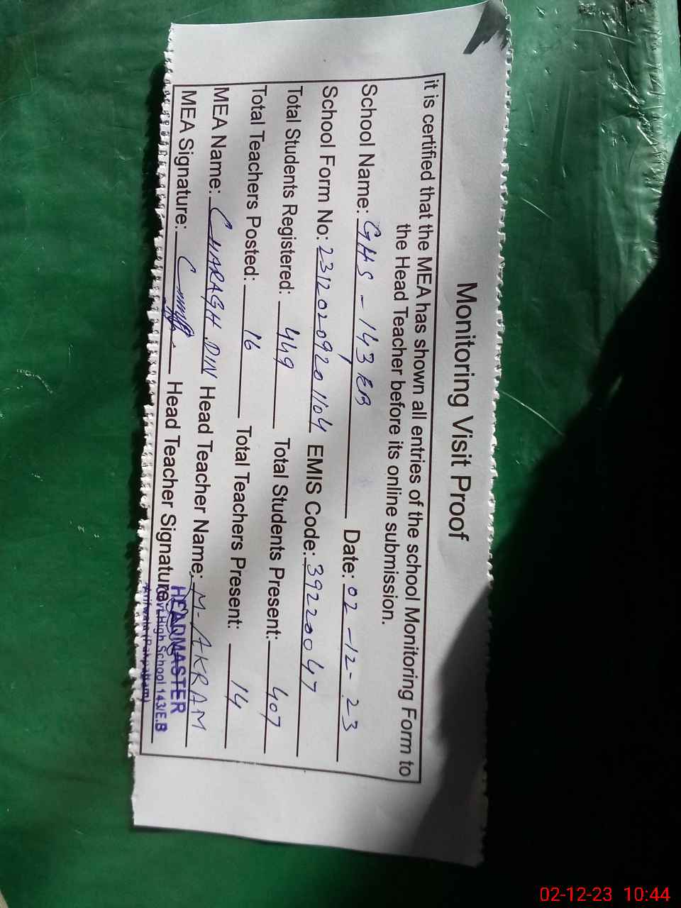 | Attendance Register | Head Teacher | MEA with School | Visit Proof |