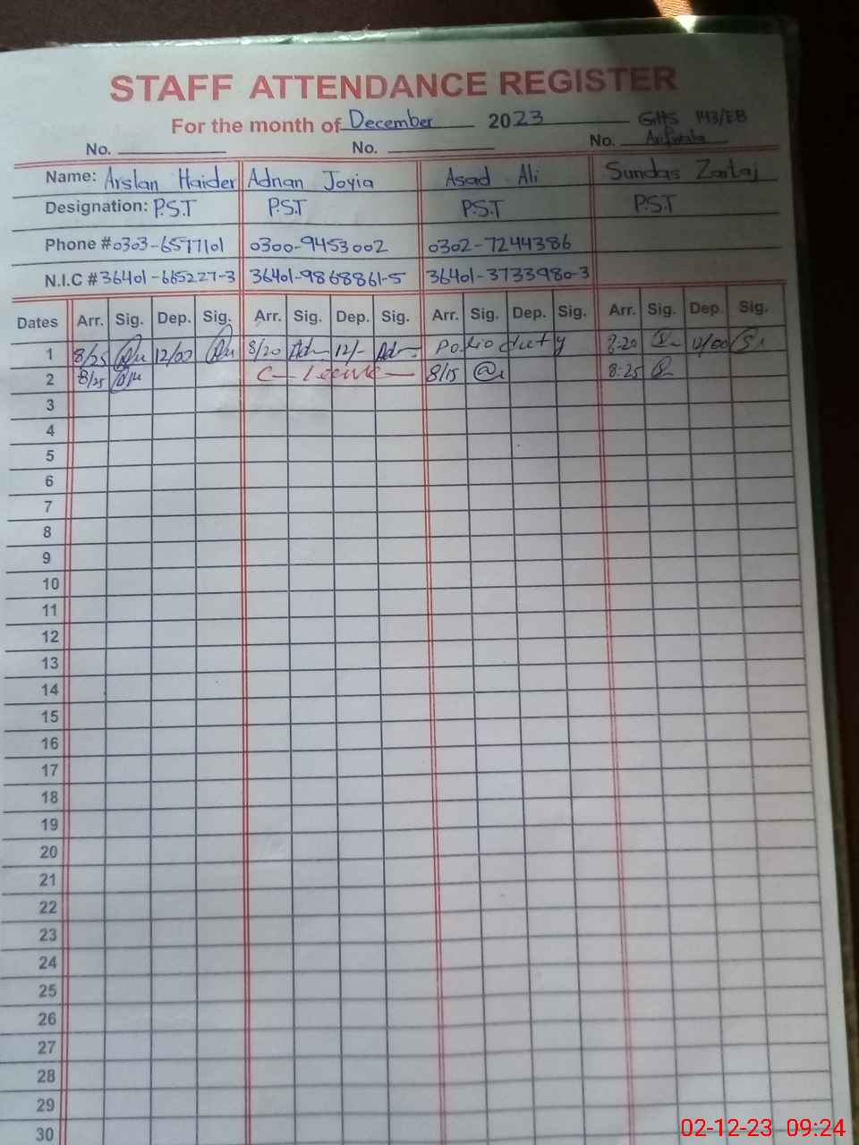 | CNIC | Full Name | Designation | R/C | Absence during last cal. month |
