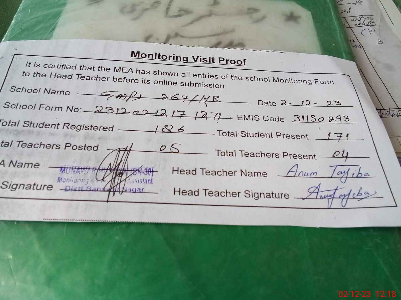 | Attendance Register | Head Teacher | MEA with School | Visit Proof |
