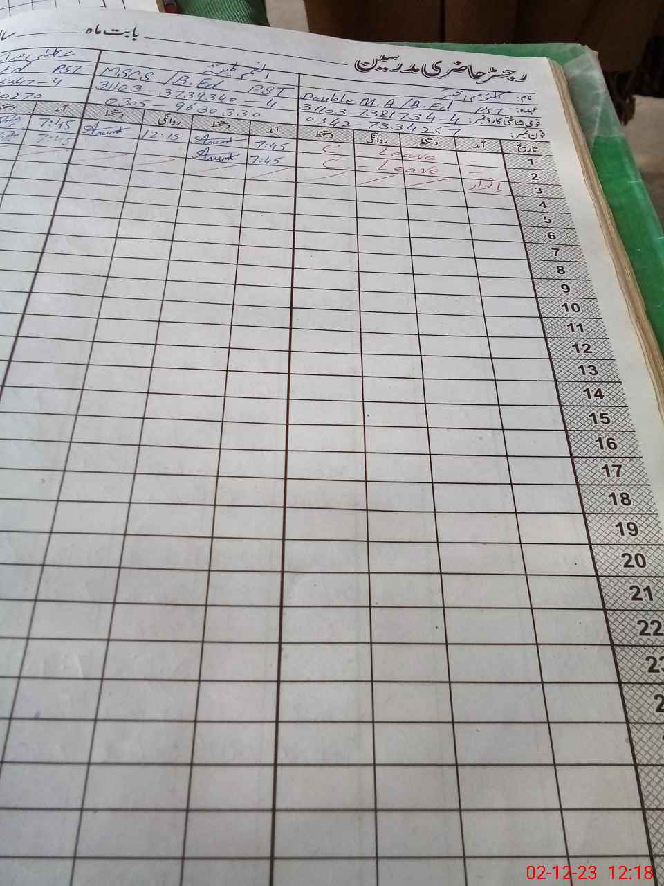 | CNIC | Full Name | Designation | R/C | Absence During Last Calender Month |