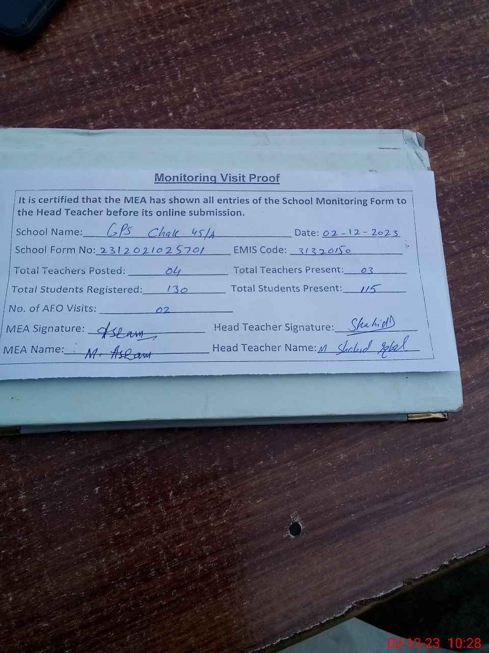 | Attendance Register | Head Teacher | MEA with School | Visit Proof |