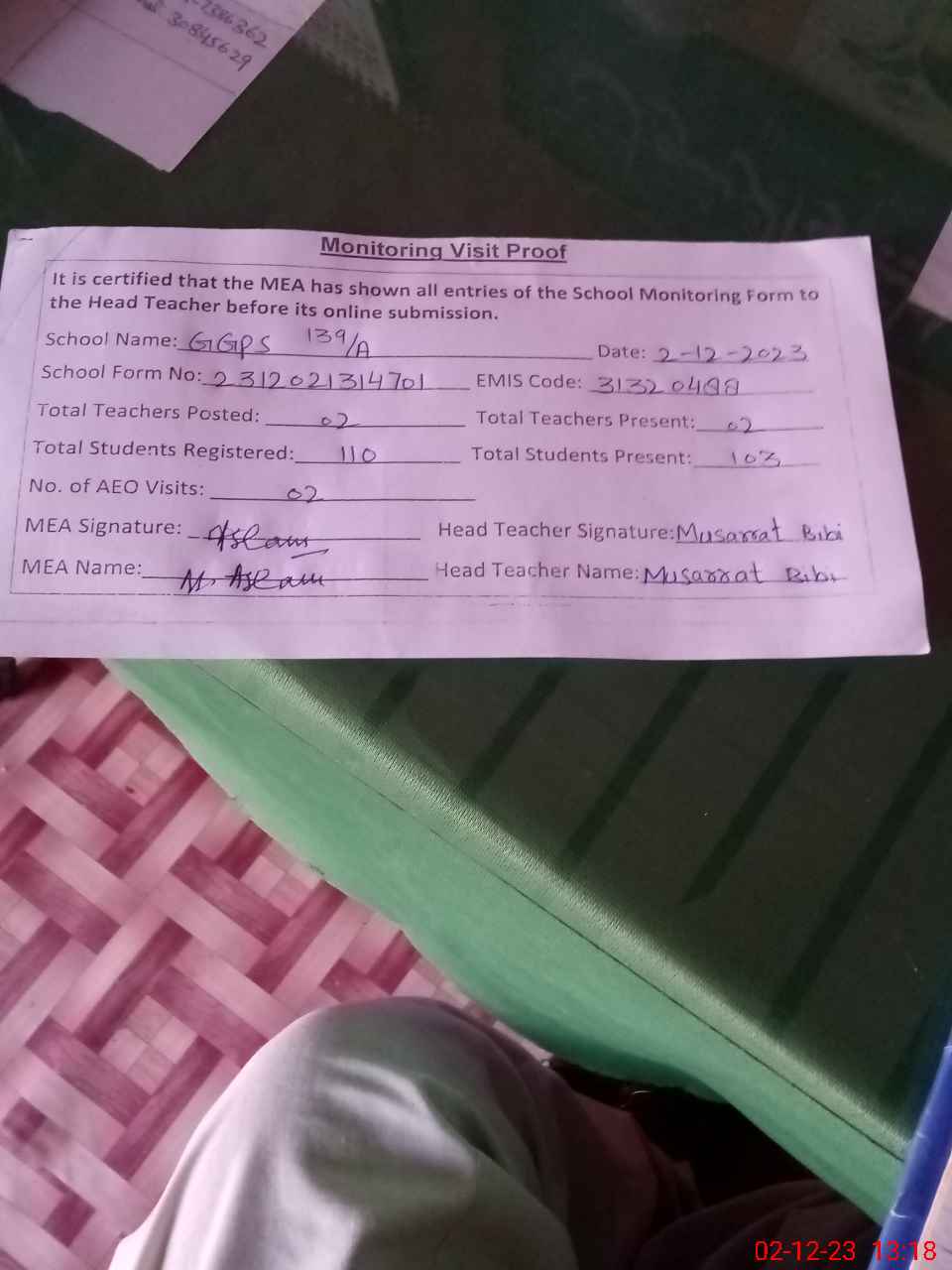 | EMIS Code: 31320488 | Name of School: GGPS CHAK NO.139/A | |||