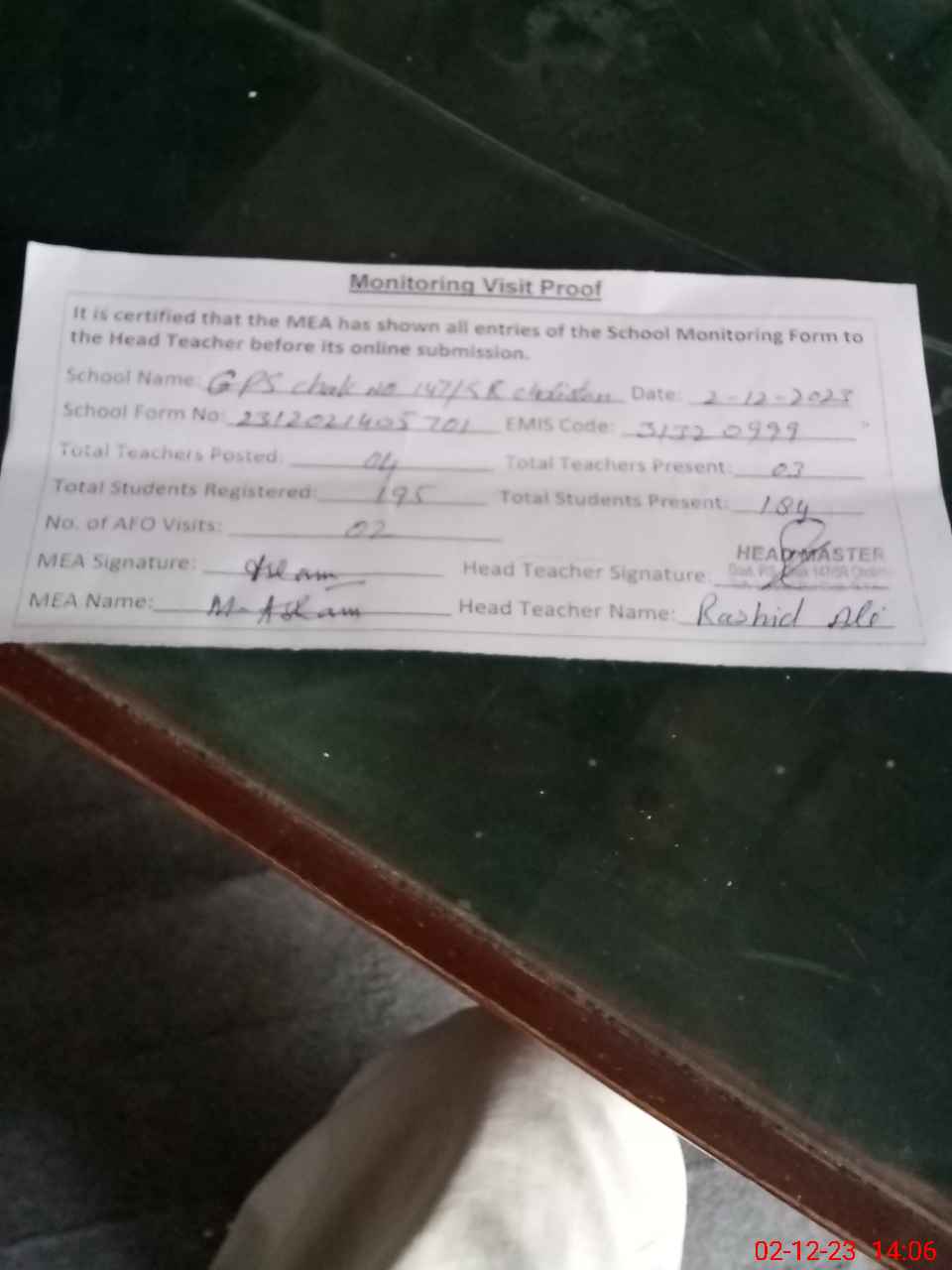 | Attendance Register | Head Teacher | MEA with School | Visit Proof |