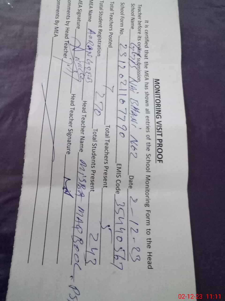 | Attendance Register | Head Teacher | MEA with School | Visit Proof |