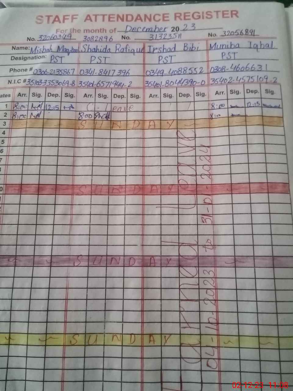 | CNIC | Full Name | Designation | R/C | Absence During Last Calender Month |