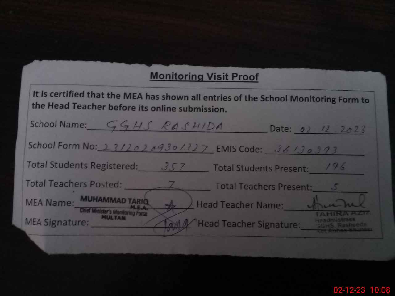 | EMIS Code: 36130393 | Name of School: GGHS RASHIDA, KOT ABBAS SHAHEED | |||