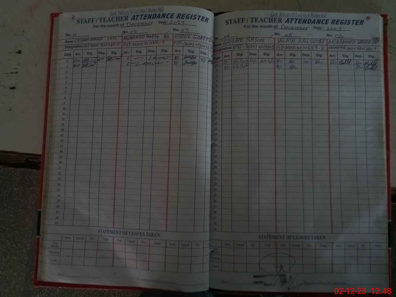 | CNIC | Full Name | Designation | R/C | Absence During Last Calender Month |
