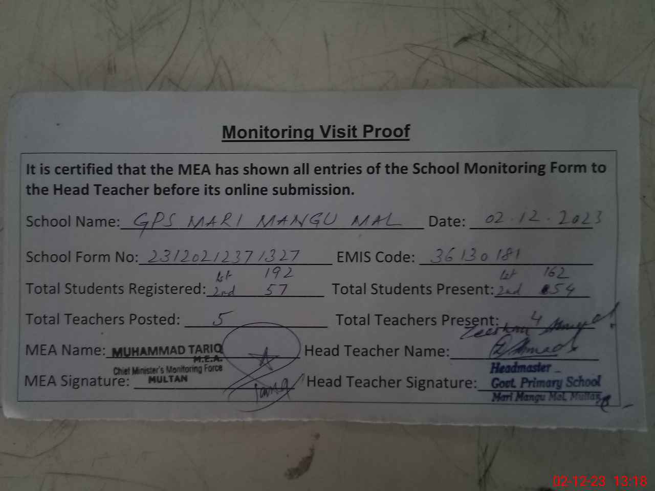 | Attendance Register | Head Teacher | MEA with School | Visit Proof |