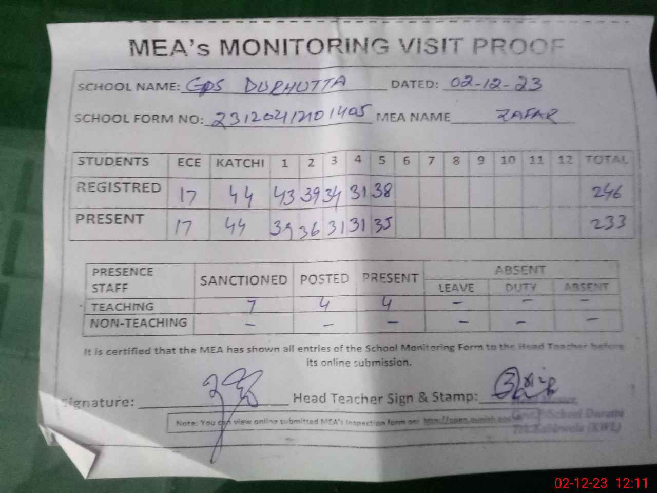 | Attendance Register | Head Teacher | MEA with School | Visit Proof |