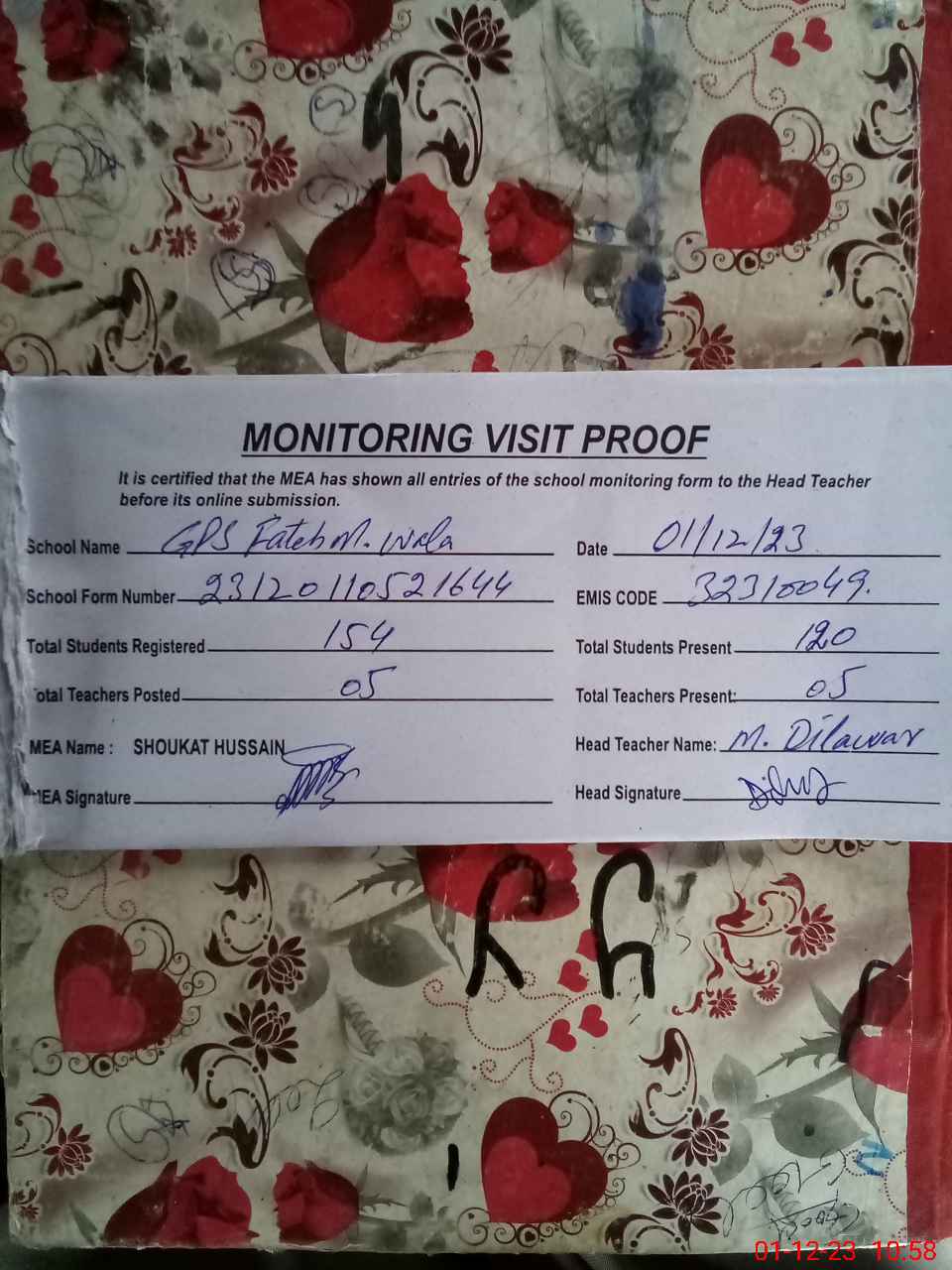 | Attendance Register | Head Teacher | MEA with School | Visit Proof |