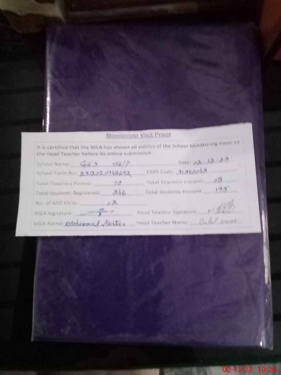 | Attendance Register | Head Teacher | MEA with School | Visit Proof |