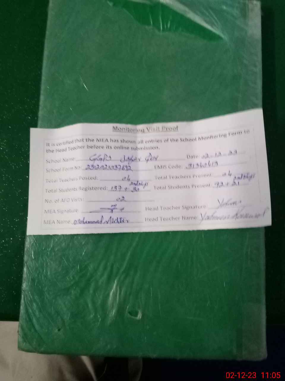 | Attendance Register | Head Teacher | MEA with School | Visit Proof |