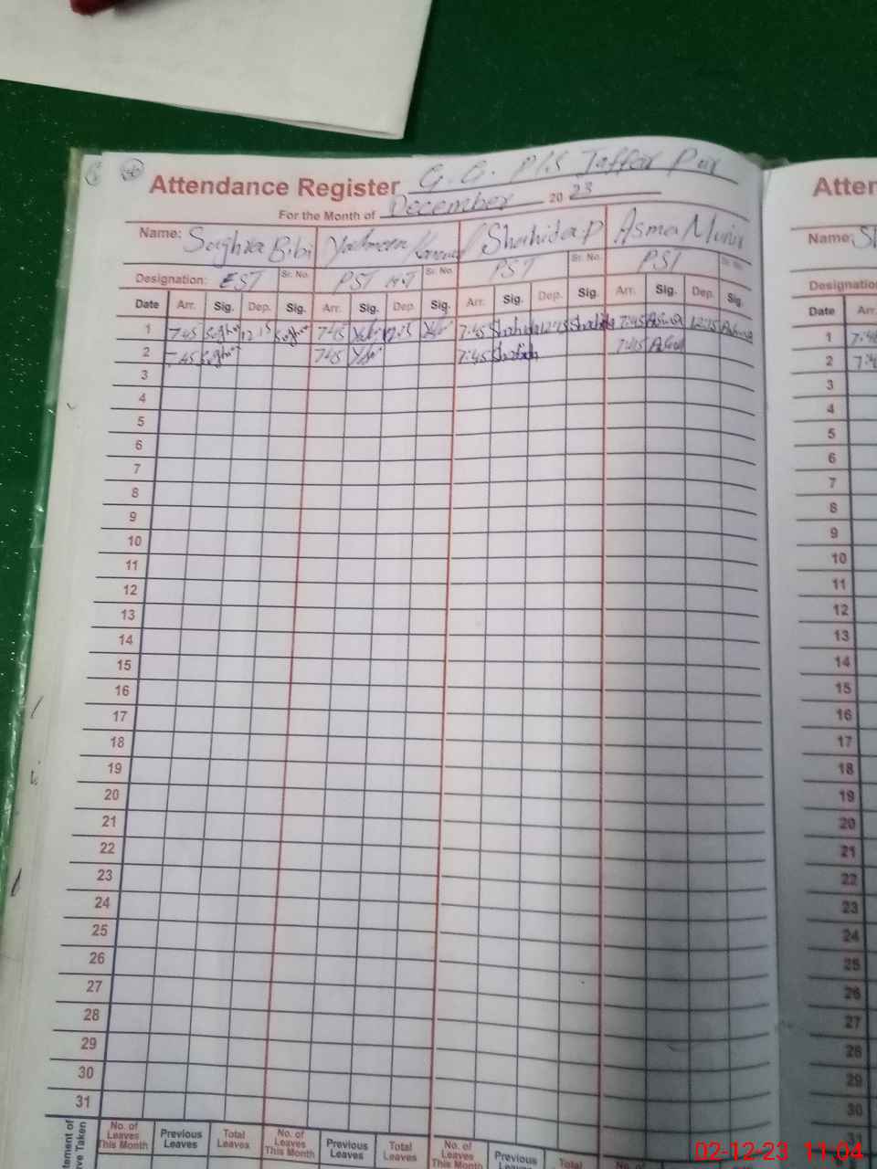 | CNIC | Full Name | Designation | R/C | Absence During Last Calender Month |