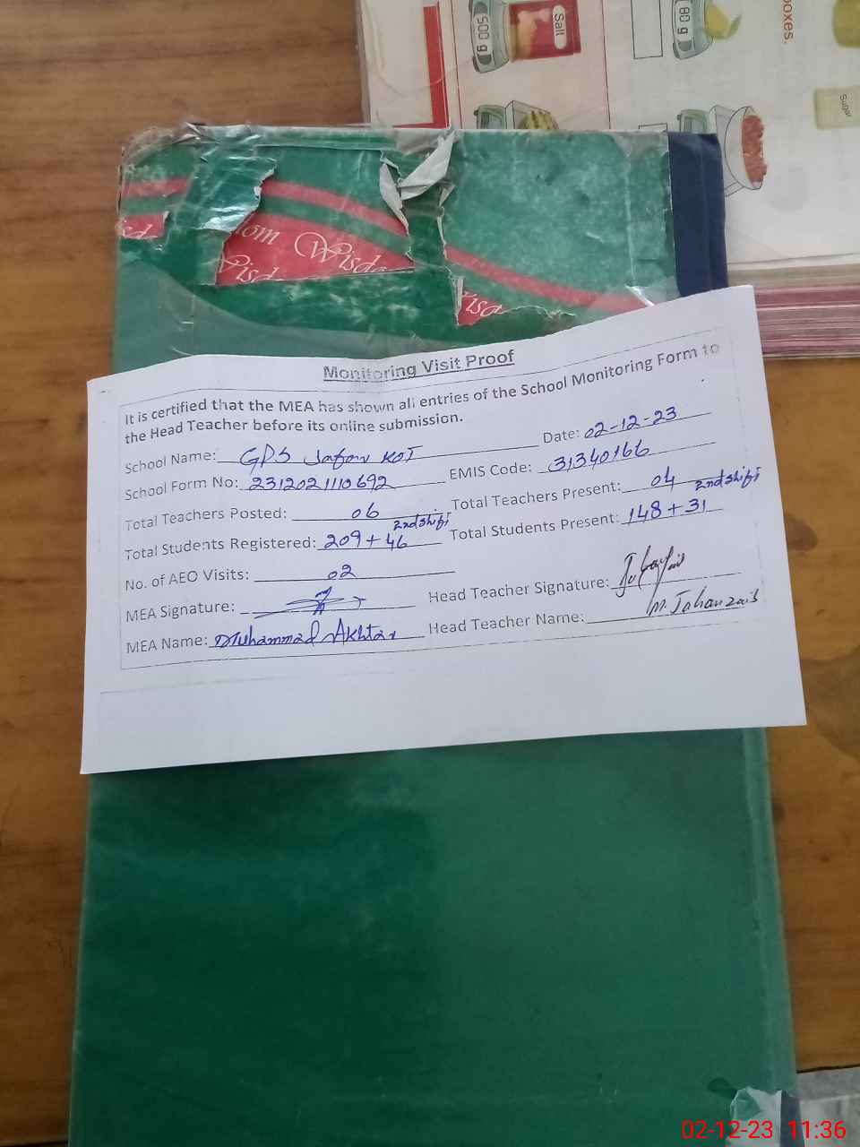 | Attendance Register | Head Teacher | MEA with School | Visit Proof |