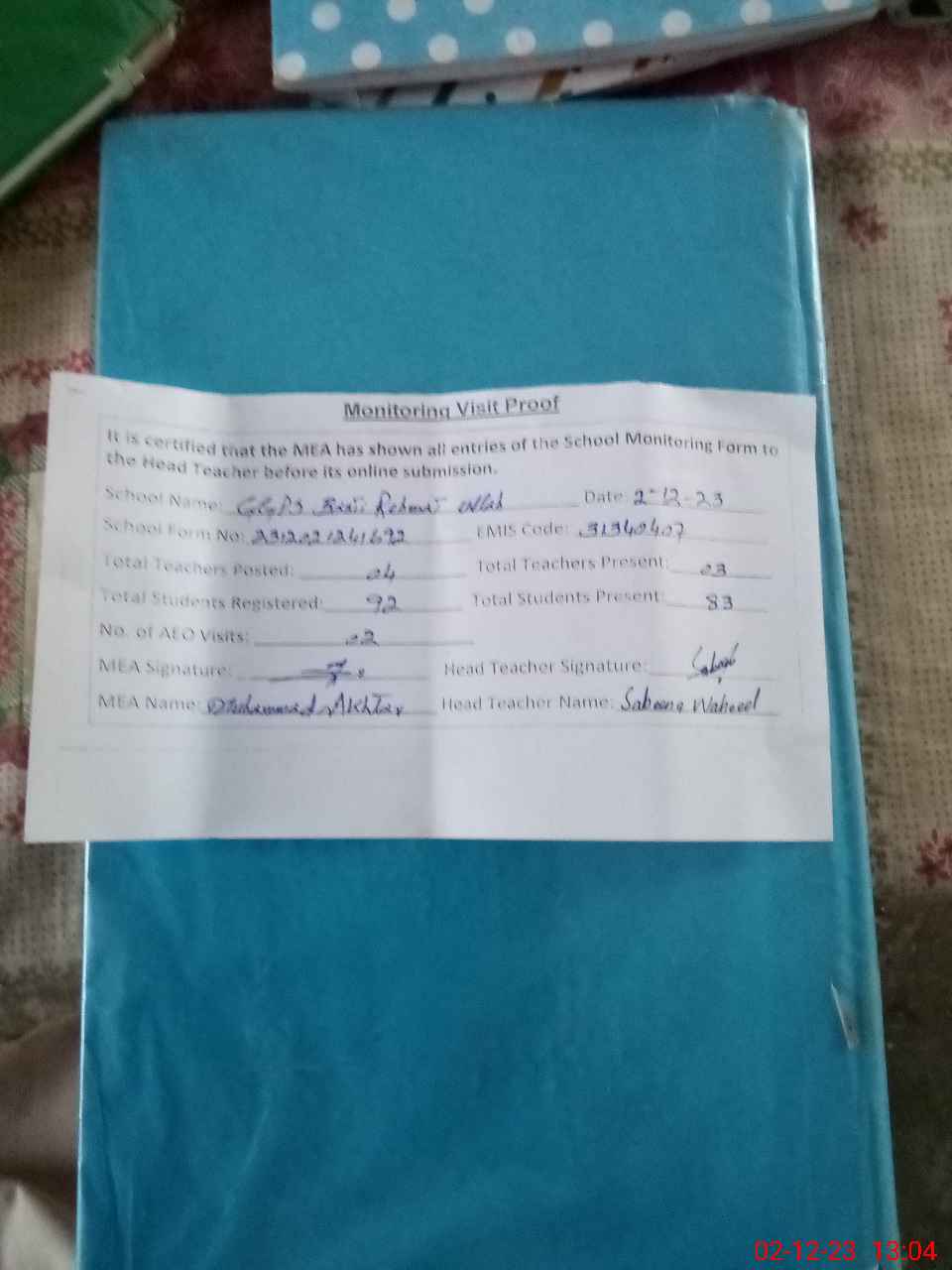 | Attendance Register | Head Teacher | MEA with School | Visit Proof |