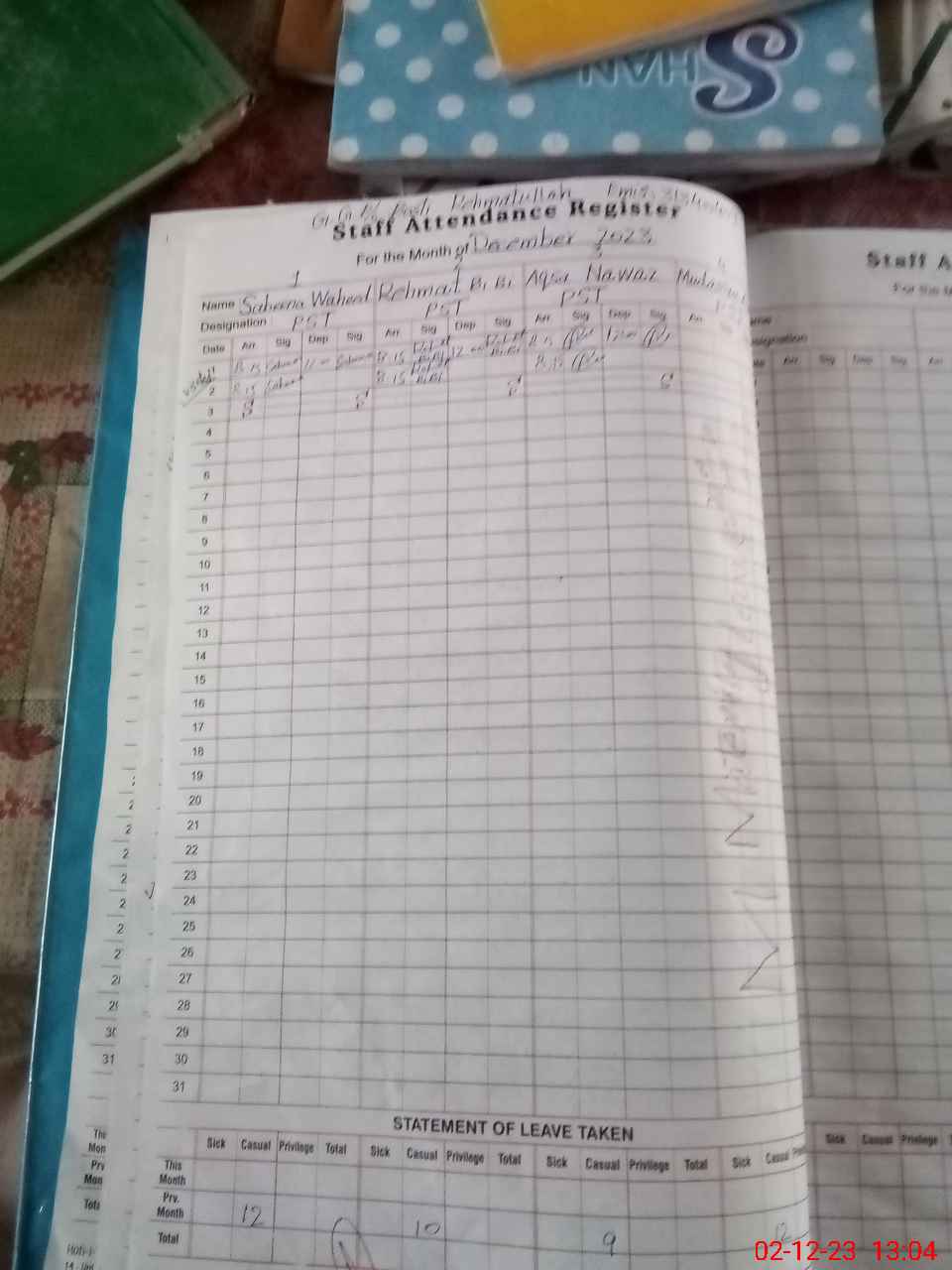 | CNIC | Full Name | Designation | R/C | Absence During Last Calender Month |