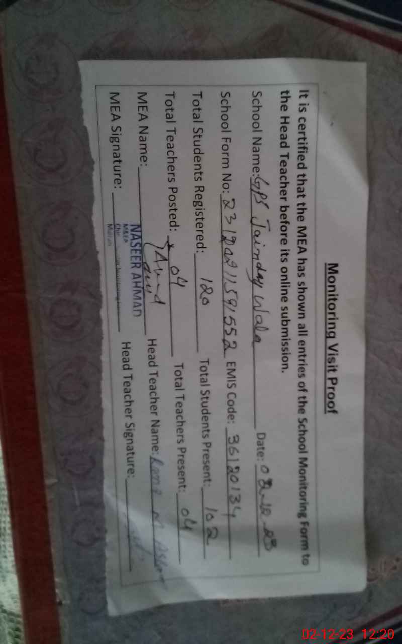 | EMIS Code: 36120134 | Name of School: GPS JAINDAY WALA P/O SIKINDARABAD | |||
