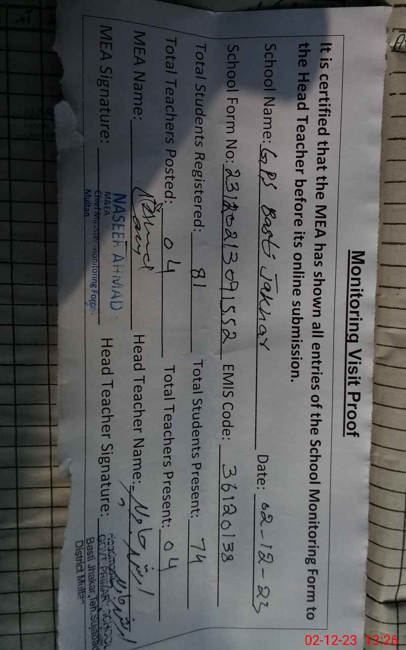 | Attendance Register | Head Teacher | MEA with School | Visit Proof |