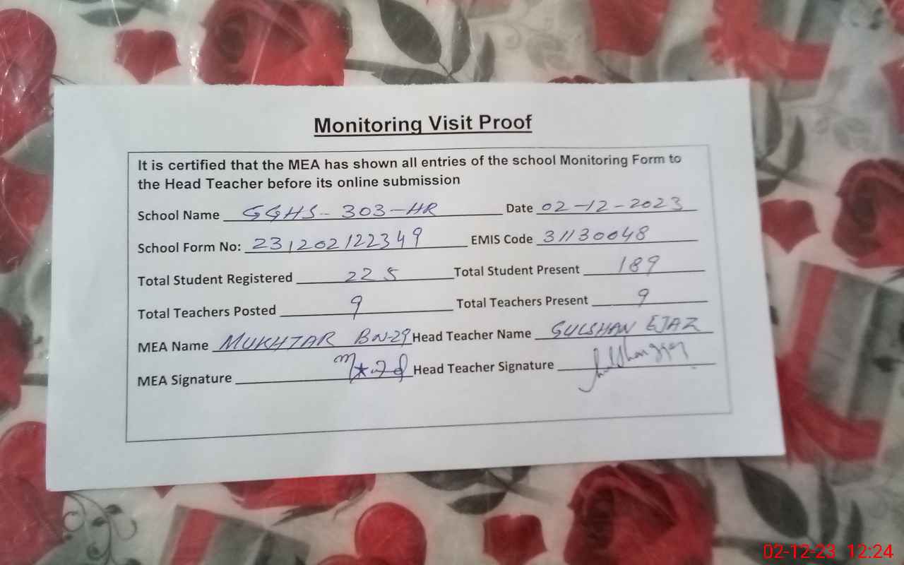 | EMIS Code: 31130048 | Name of School: GGHS CHAK NO. 303/HR | |||