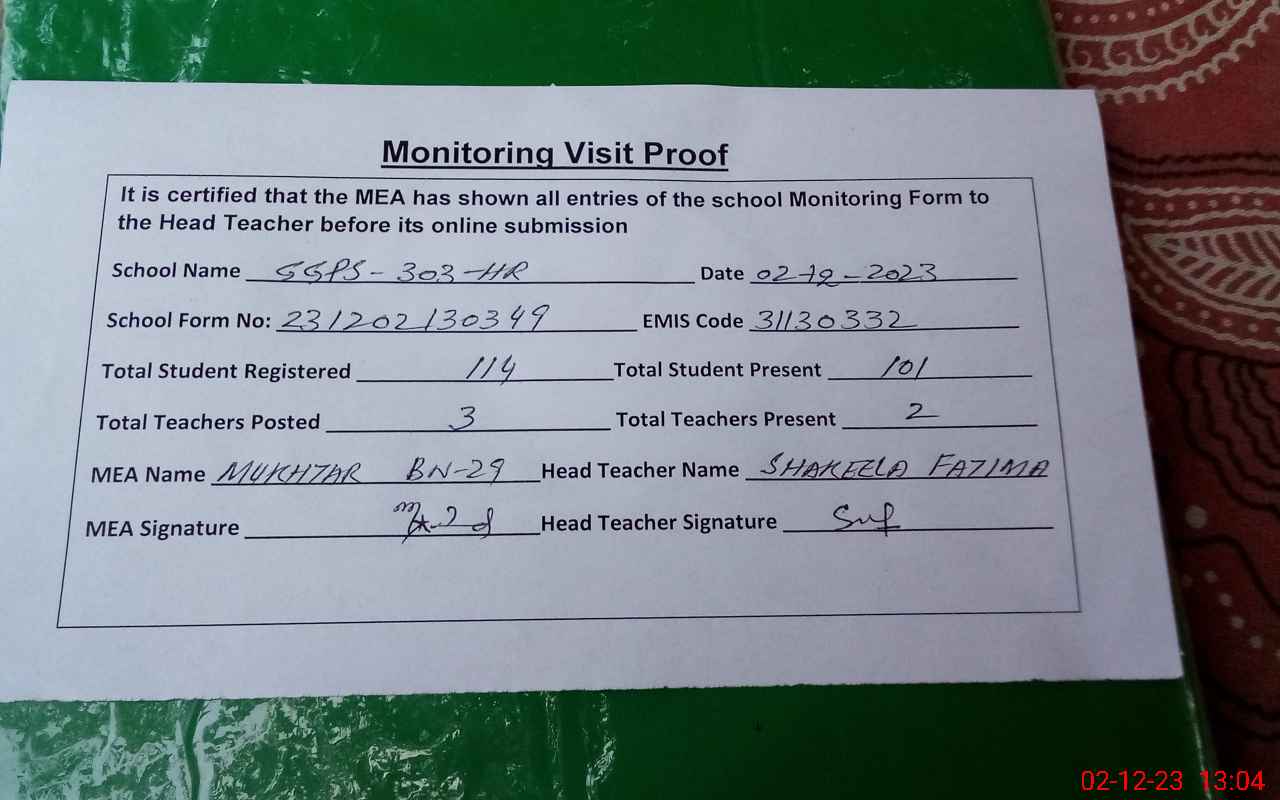 | EMIS Code: 31130332 | Name of School: GGPS CHAK NO. 303/HR | |||