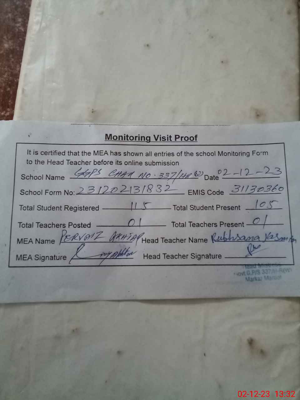 | EMIS Code: 31130360 | Name of School: GGPS CHAK NO 337 HR W | |||