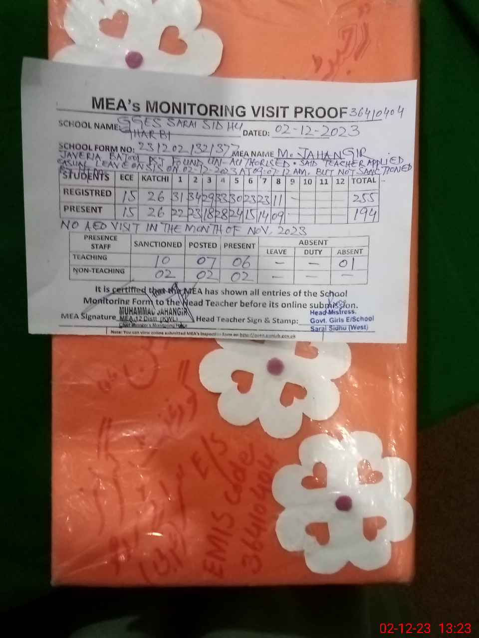 | Remarks (Use Separate Page if Required): JAVERIA BATOOL PST FOUND UN AUTHORISED SAID TEACHER APPLIED CASUAL LEAVE ON SIS ON 02 DECEMBER 2023 AT 09 07 12 AM BUT NOT SANCTIONED BY HEAD MISTRESS STATUS WAS WAITING FOR APPROVAL OF HM NO AEO VISIT IN THE MONTH OF NOVEMBER 2023 NSB GRANTS AND FTF RECORDS ARE NOT MAINTAINED BANK STATEMENTS ARE NOT AVAILABLE ONE TOILET FOUND NON FUNCTIONAL BECAUSE MOTOR PUMP IS FITTED IN THIS TOILET ALL HAND WASHING POINTS ARE WITHOUT SOAP NO TIME TABLE IS MADE OR DISPLAYED IN CLASSES RANDOM CLASS ECE IS NOW IN CLASS TWO | |||||