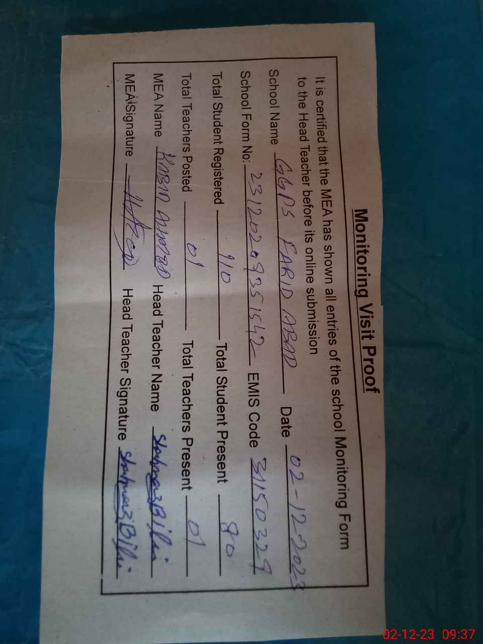 | EMIS Code: 31150329 | Name of School: GGPS FARID ABAD | |||