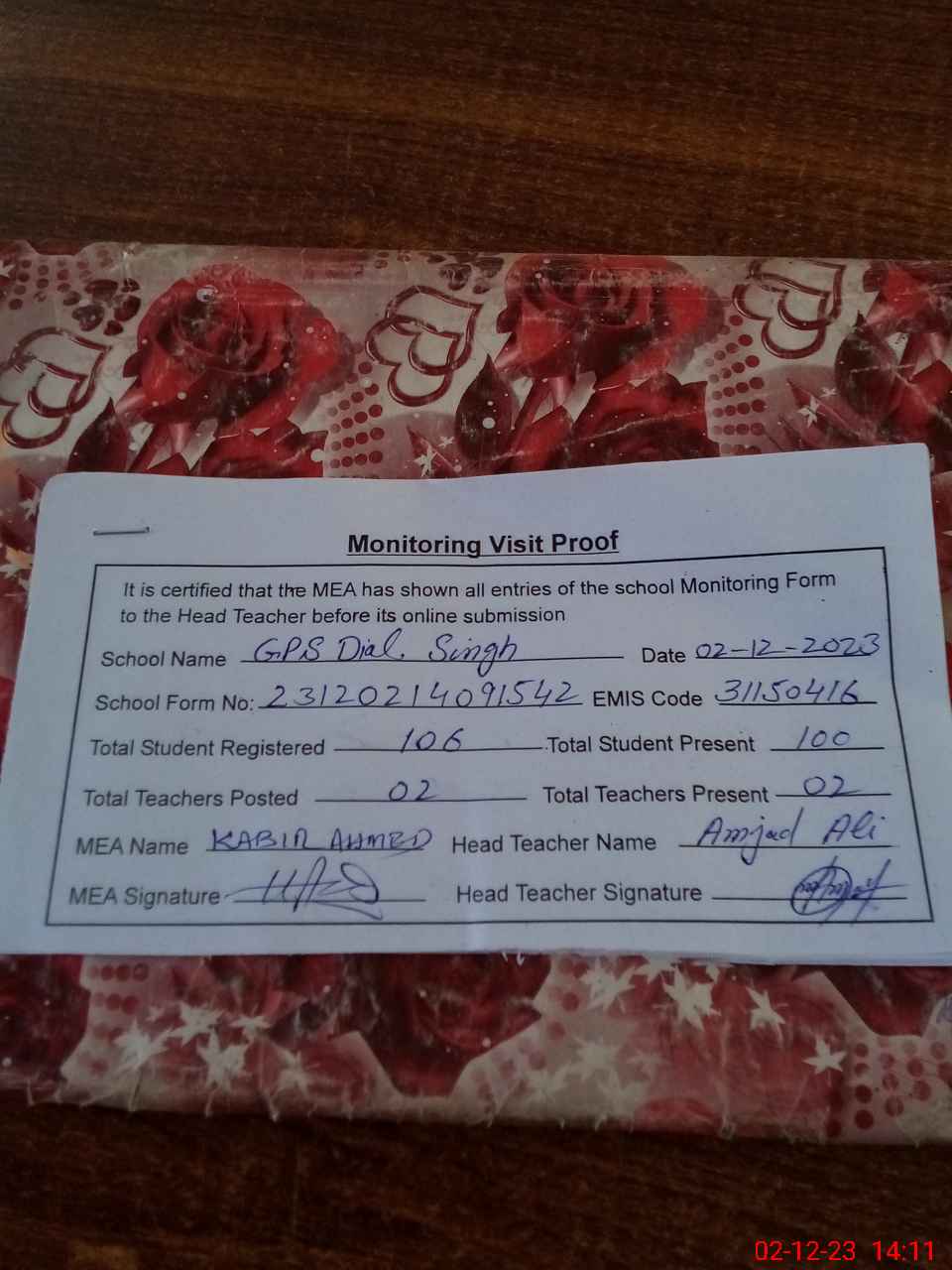| EMIS Code: 31150416 | Name of School: GPS DIAL SINGH | |||
