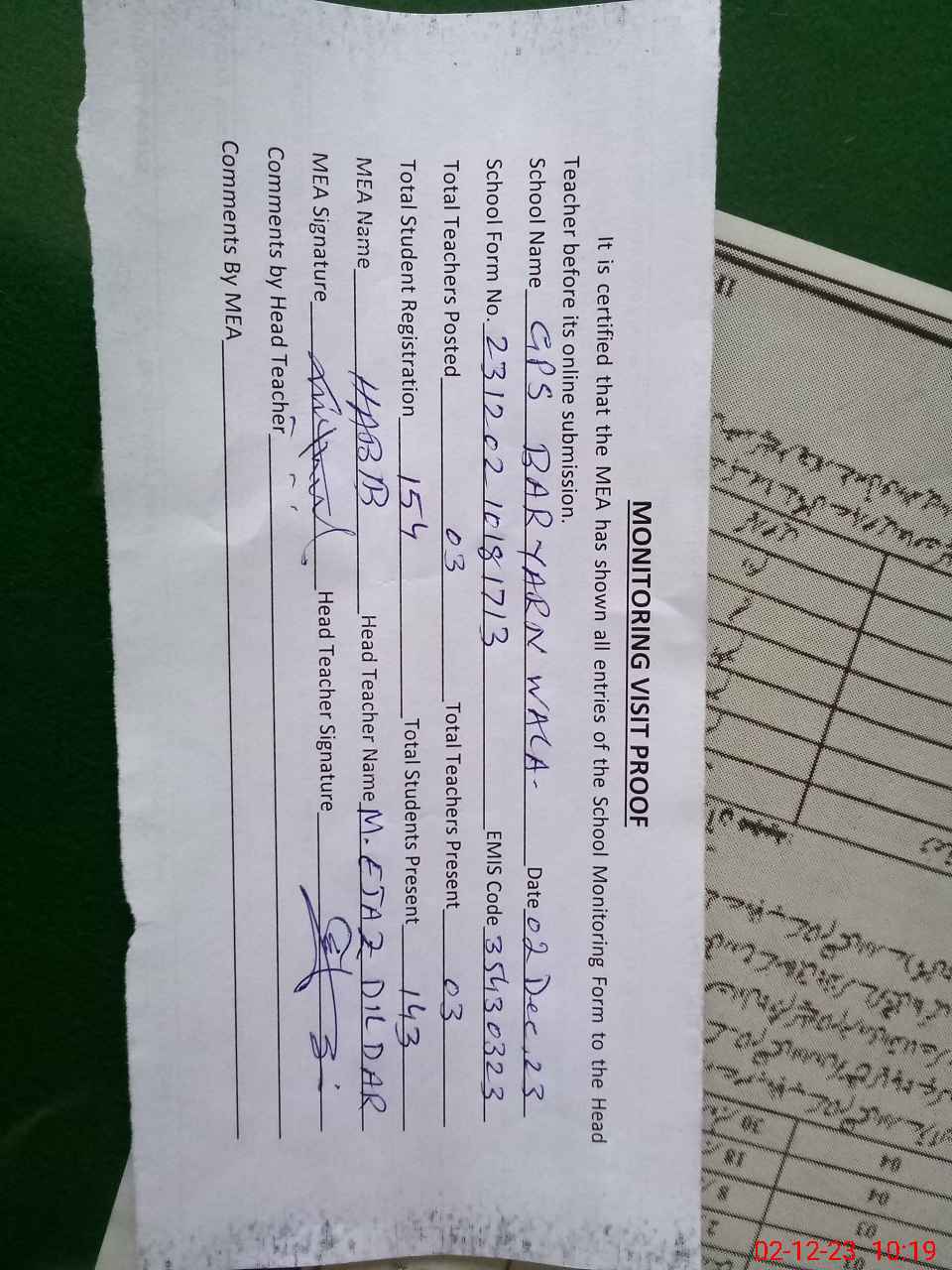 | Attendance Register | Head Teacher | MEA with School | Visit Proof |