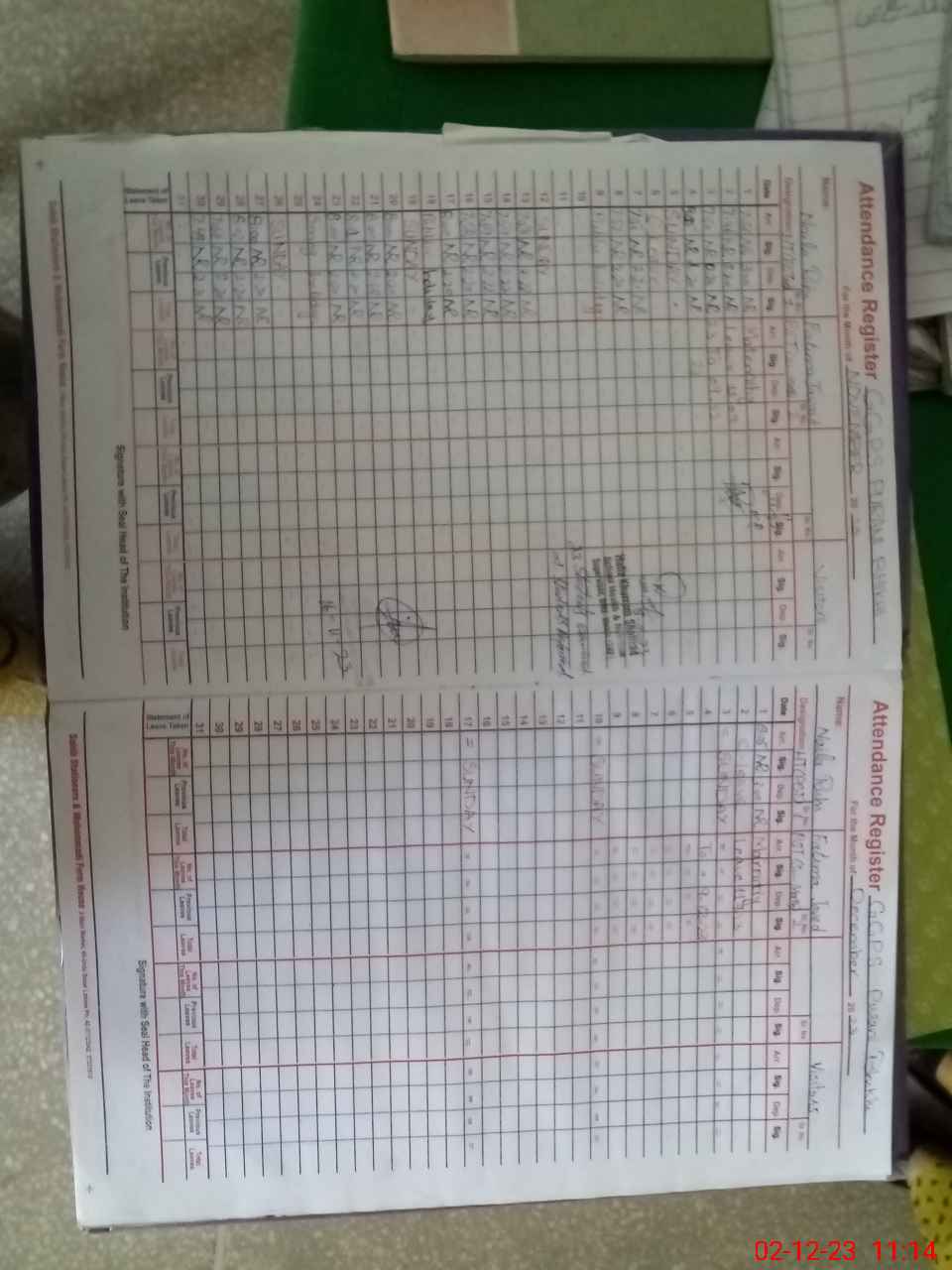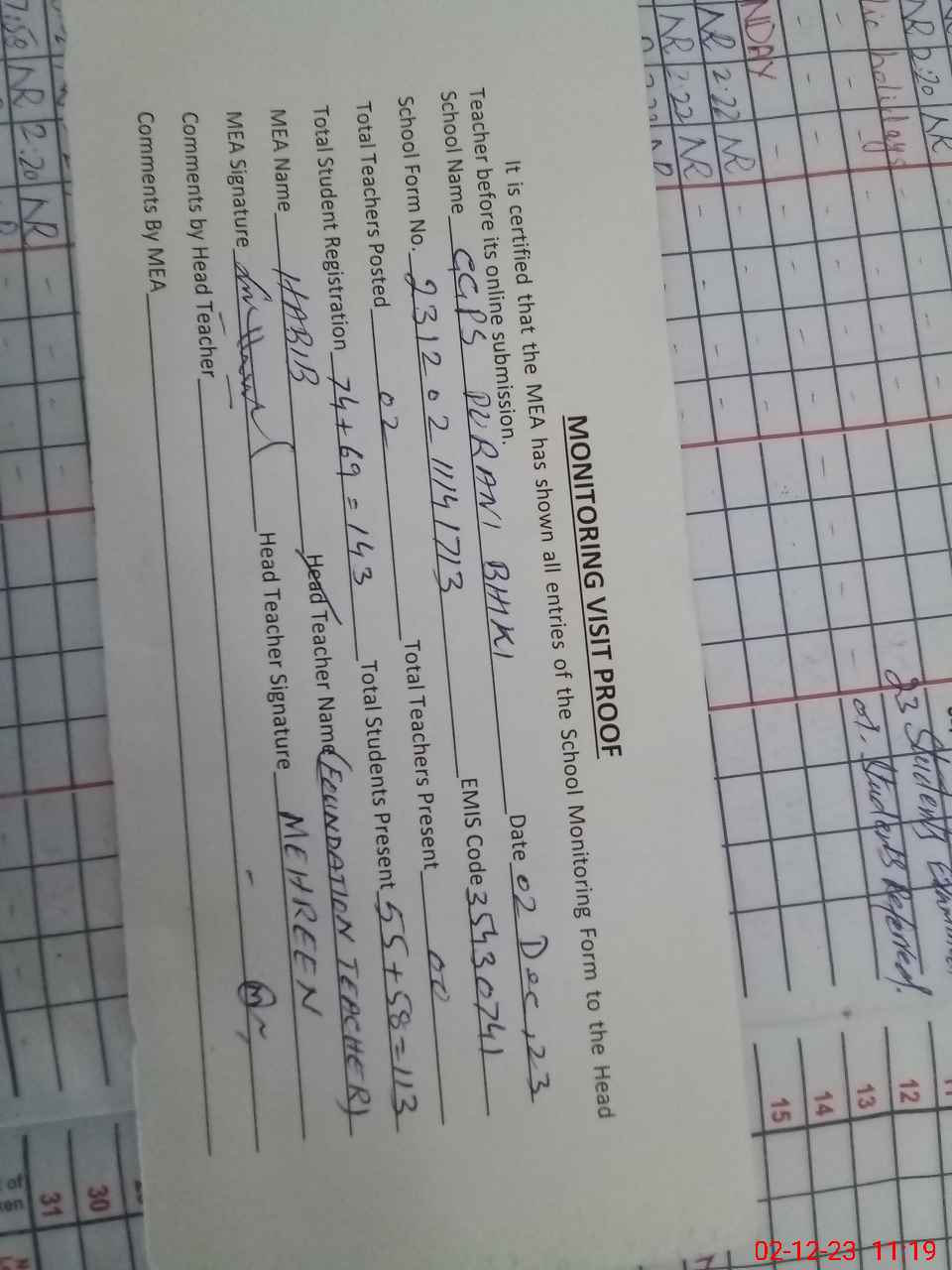 | Attendance Register | Head Teacher | MEA with School | Visit Proof |