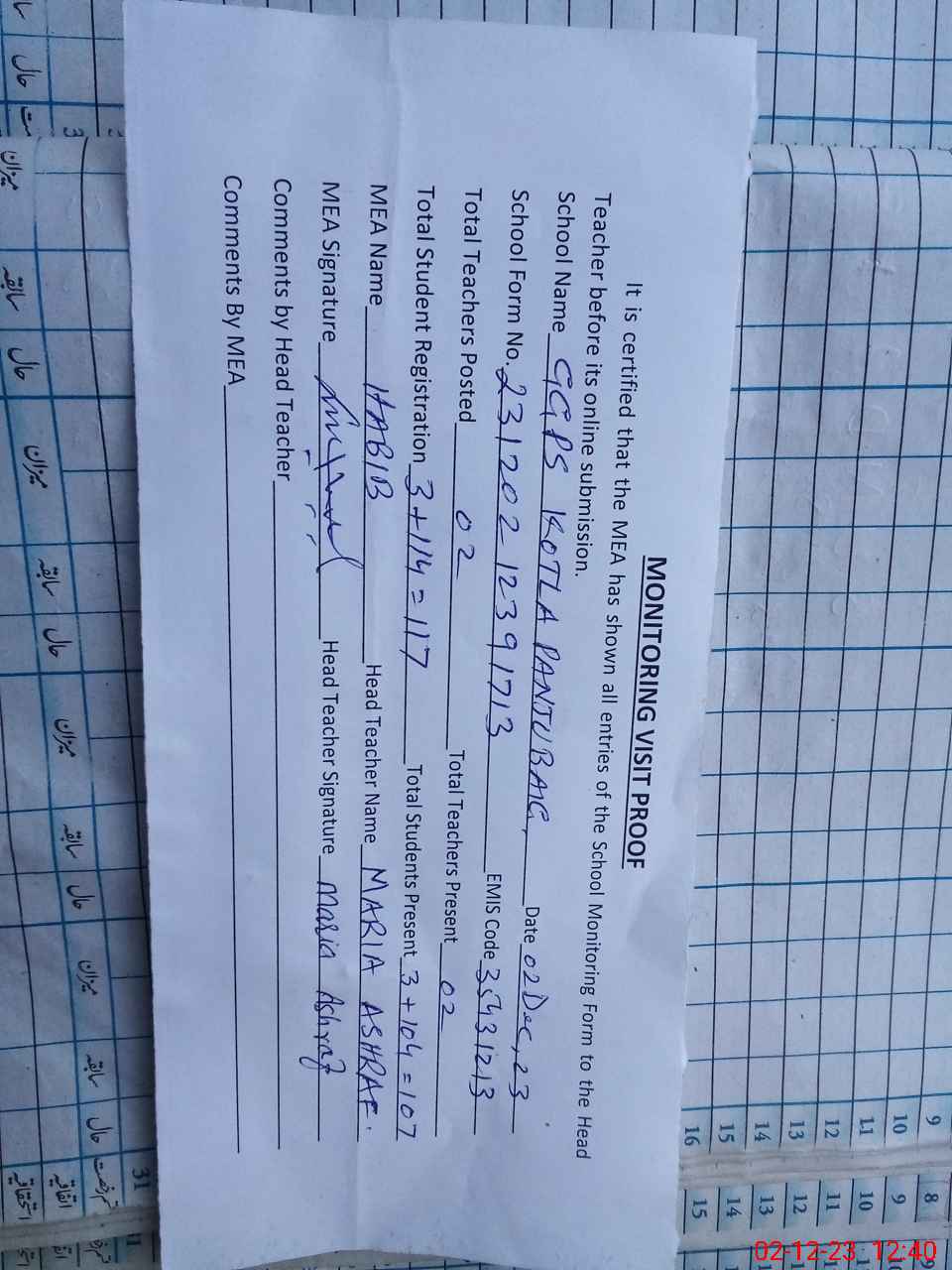 | Attendance Register | Head Teacher | MEA with School | Visit Proof |