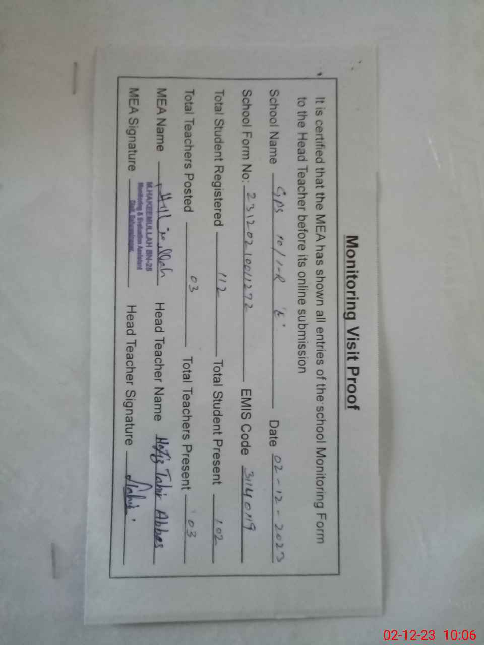 | Attendance Register | Head Teacher | MEA with School | Visit Proof |