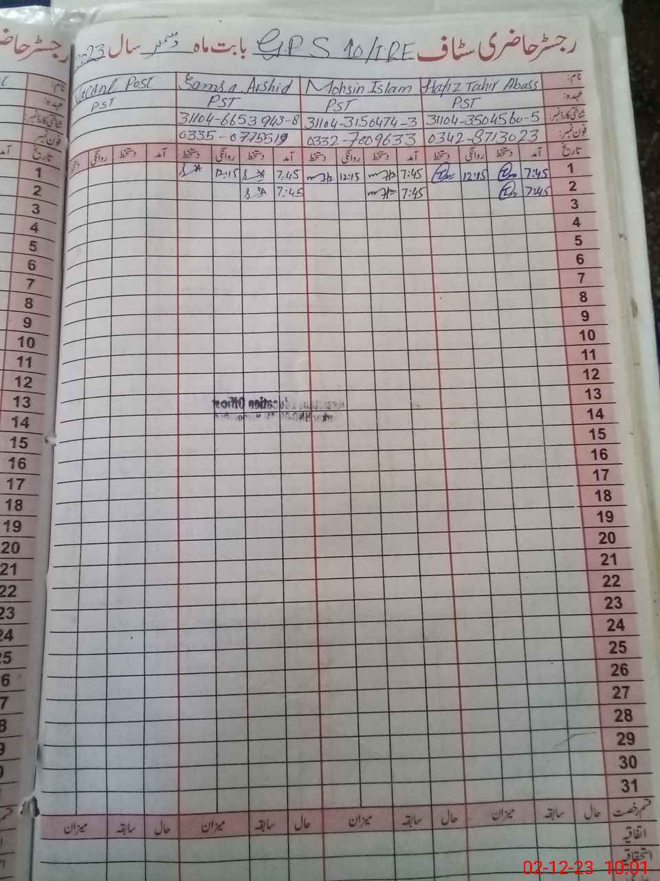 | CNIC | Full Name | Designation | R/C | Absence During Last Calender Month |