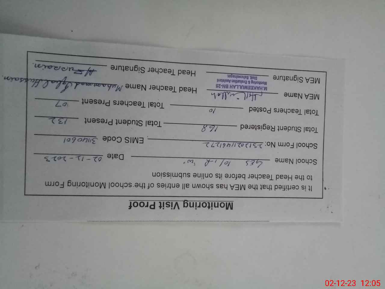 | Monitoring Date: 02-12-2023 | Start Time: 02-12-2023 11:35 AM | End Time: 02-12-2023 12:07 PM | Name of MEA: Mu**** ha**** ul**** BN25 | |