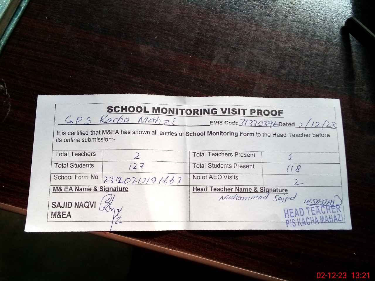 | EMIS Code: 31330396 | Name of School: GPS KACHA MAHZI | |||