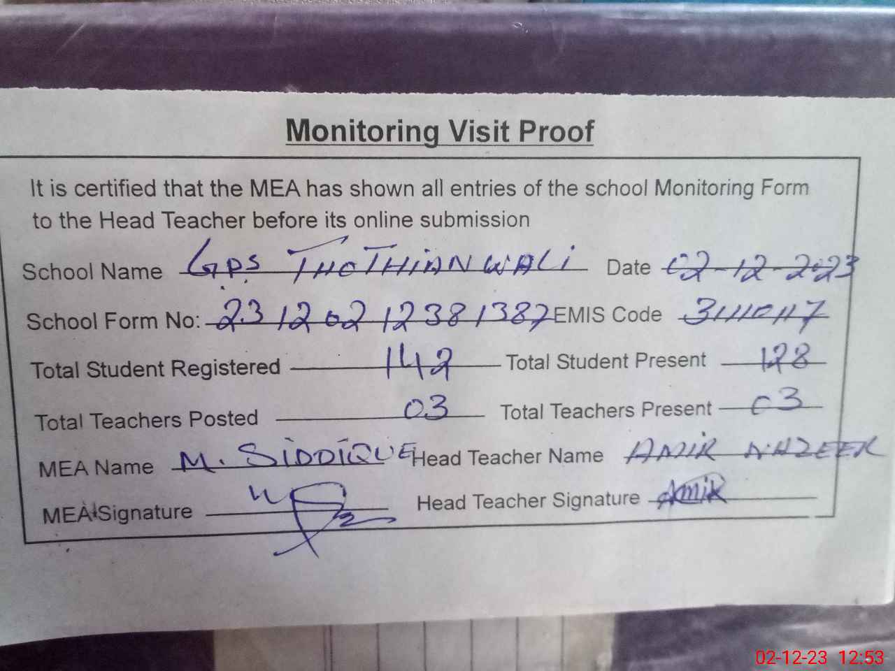 | Attendance Register | Head Teacher | MEA with School | Visit Proof |