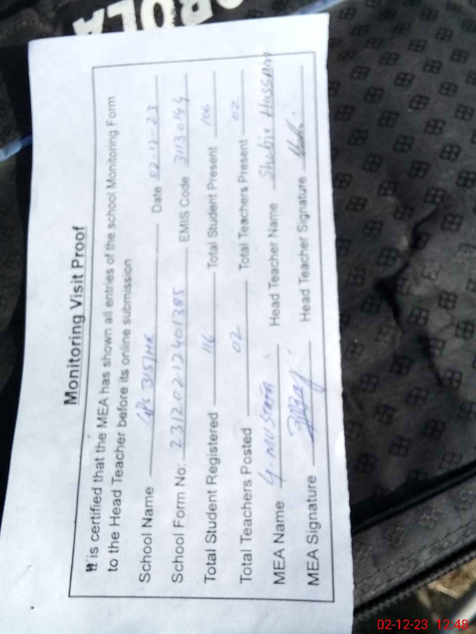 | Attendance Register | Head Teacher | MEA with School | Visit Proof |