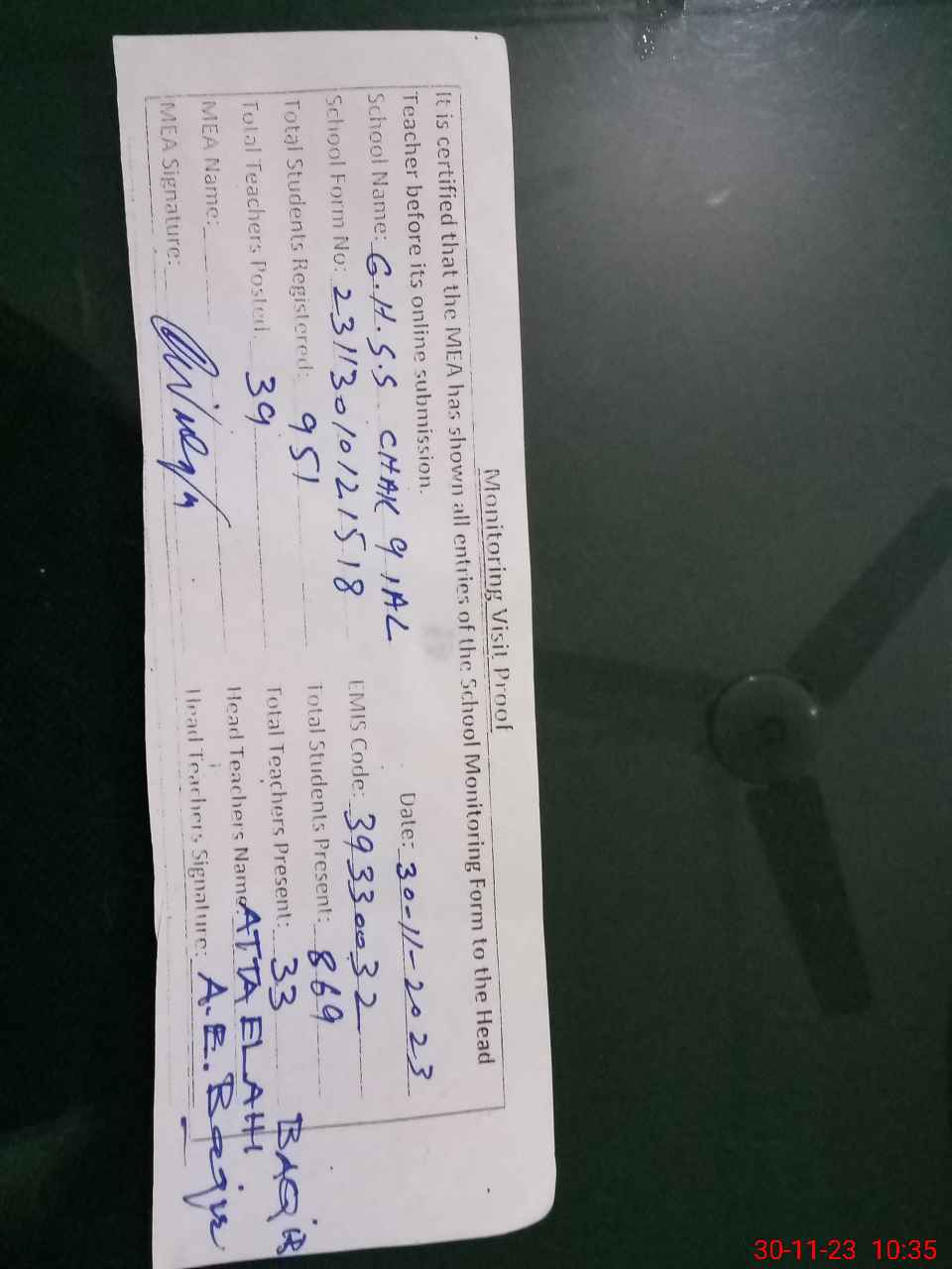 | Attendance Register | Head Teacher | MEA with School | Visit Proof |