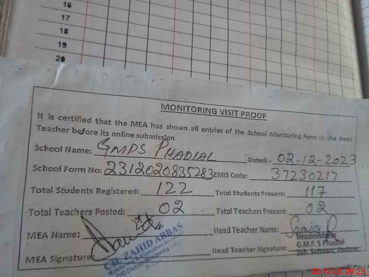 | Attendance Register | Head Teacher | MEA with School | Visit Proof |