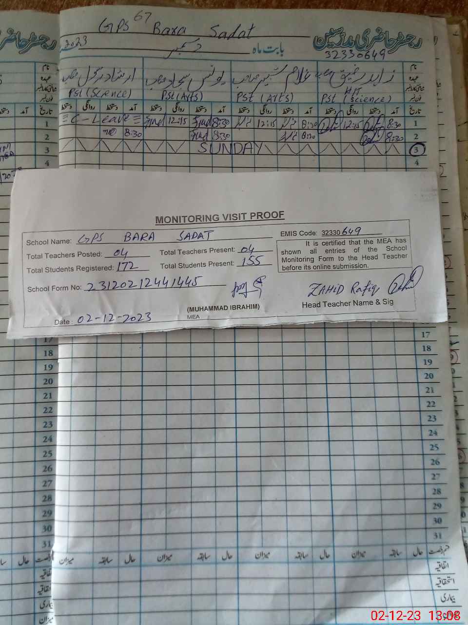 | EMIS Code: 32330649 | Name of School: GPS BARA SADAT | |||