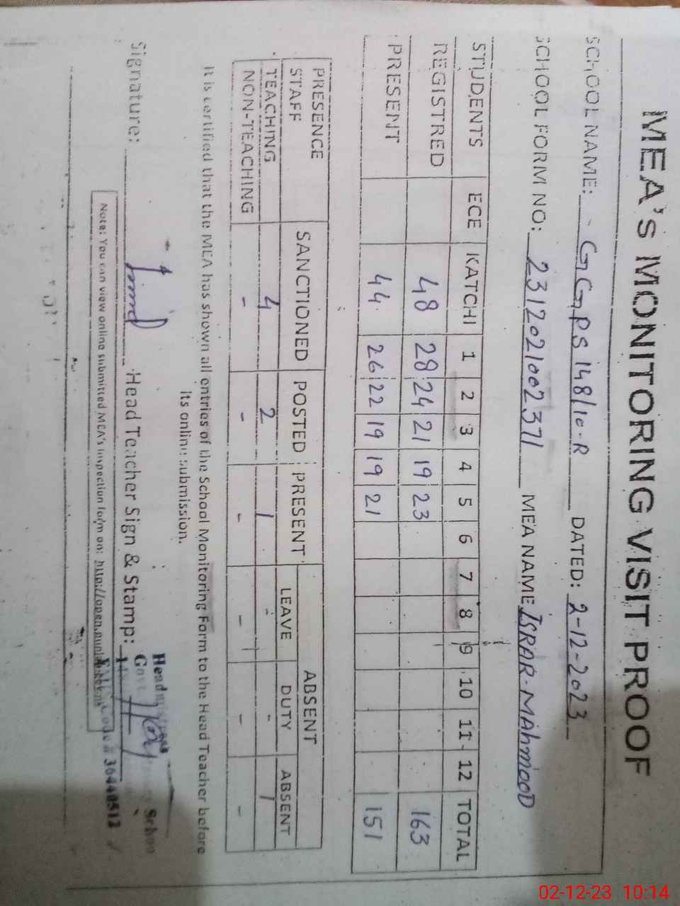 | Attendance Register | Head Teacher | MEA with School | Visit Proof |