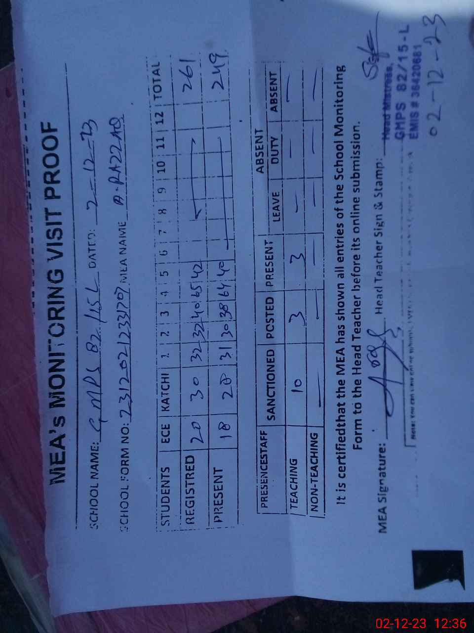 | EMIS Code: 36420681 | Name of School: GMPS CHAK NO. 82/15-L KACHA KHUH | |||